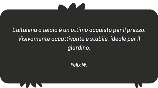 Pronti a giocare in un attimo: Con l'aiuto del nostro semplice manuale di istruzioni e non più di due chiavi, la vostra nuova altalena o amaca si monta in un attimo ed è pronta per il primo utilizzo.